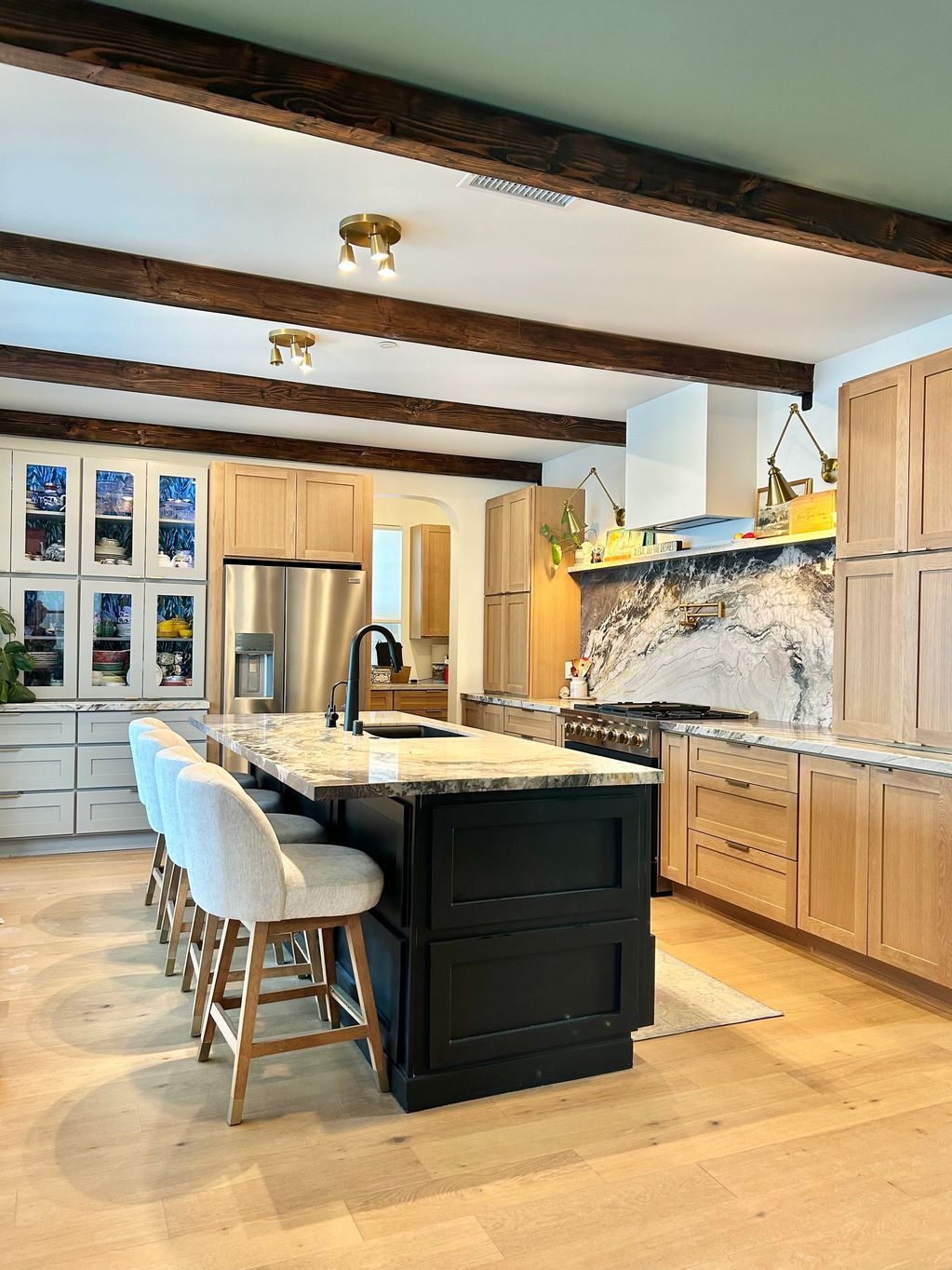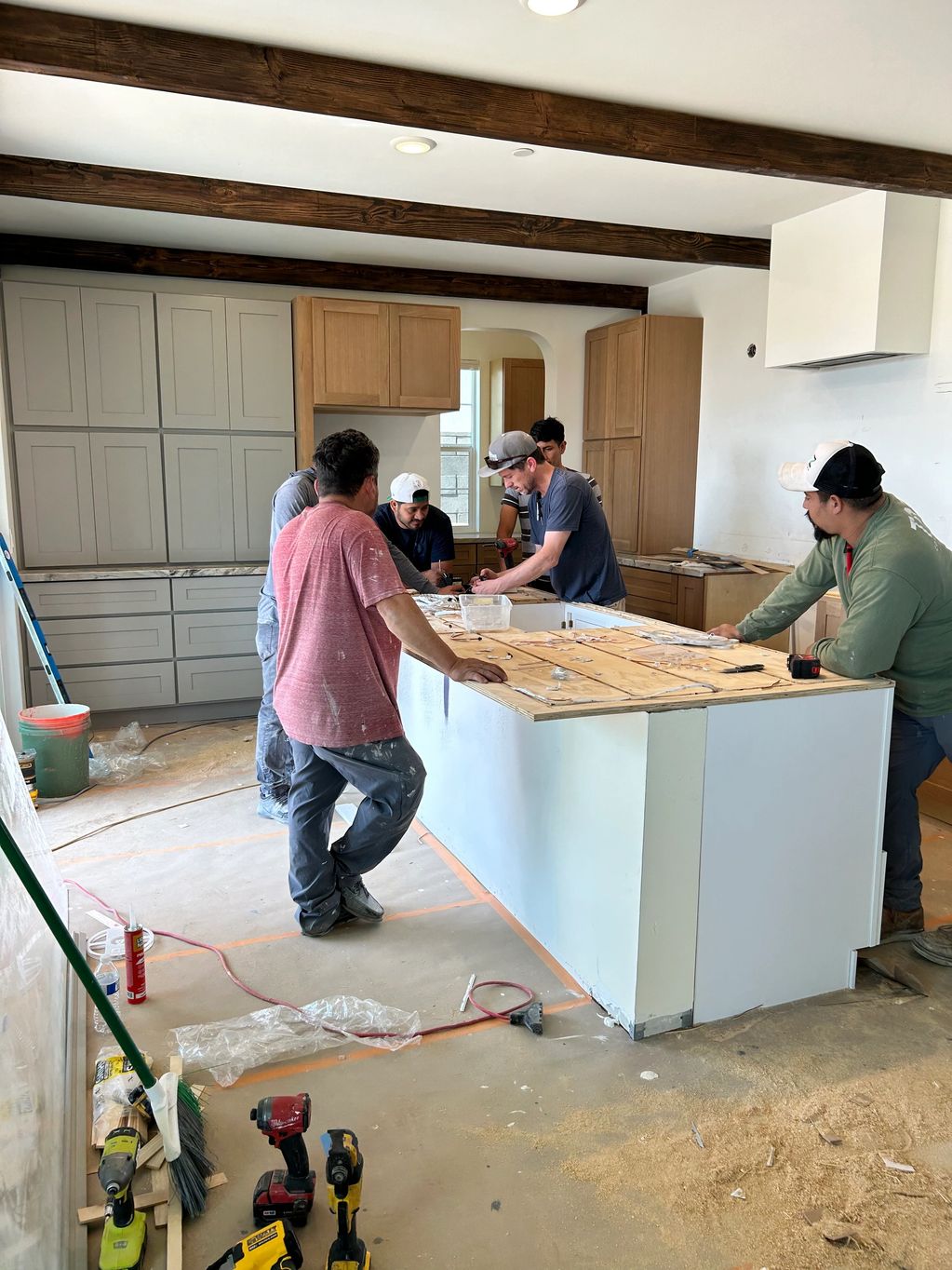 While installation of cabinets begins, the team finalizes design and installation of countertops, backsplash, fixtures, and appliances.